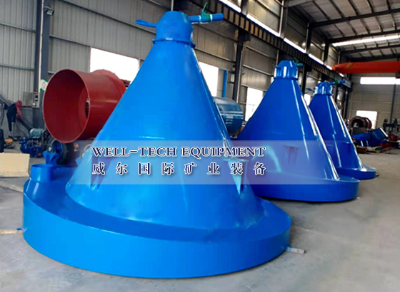 脱泥斗具有结构简单,易于制造,不耗动力等优点。由于锥体容积较大,在生产流程中还有贮矿作用。目前主要用在水力分级机前对原矿进行脱泥,借以提高分级效率;并也安装在磨矿设备前进行矿石的浓缩、脱水,以提高磨矿机的给矿浓度;还有用在各种矿泥选别设备前控制给矿浓度和矿量。